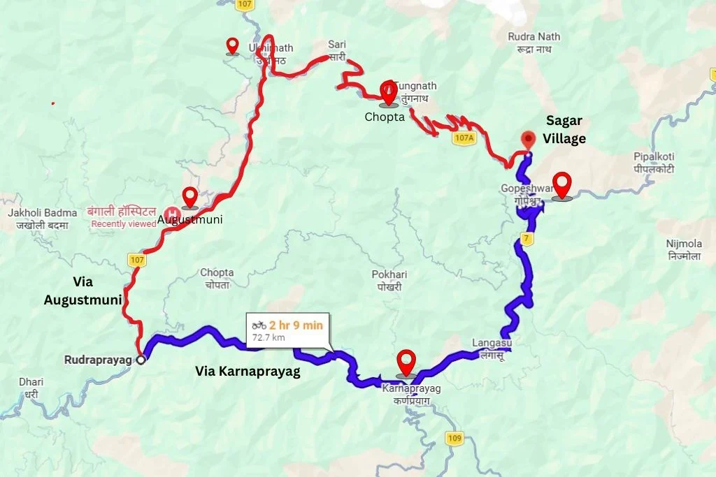 Haridwar / Rishikesh → Devprayag →Srinagar →Rudraprayag → Agastyamuni → Kund(107A) → Ukhimath → Chopta(107A) → Sagar Village