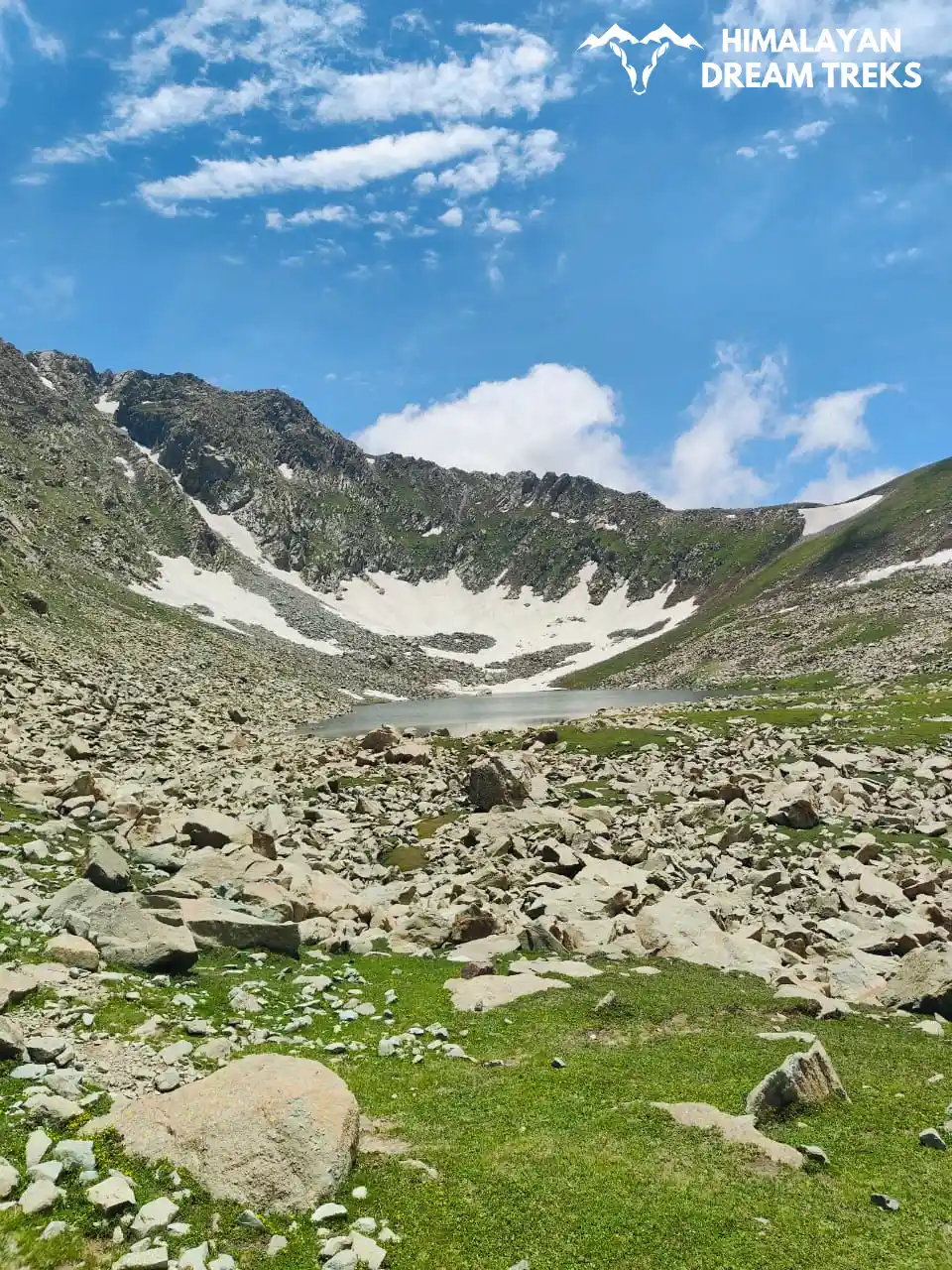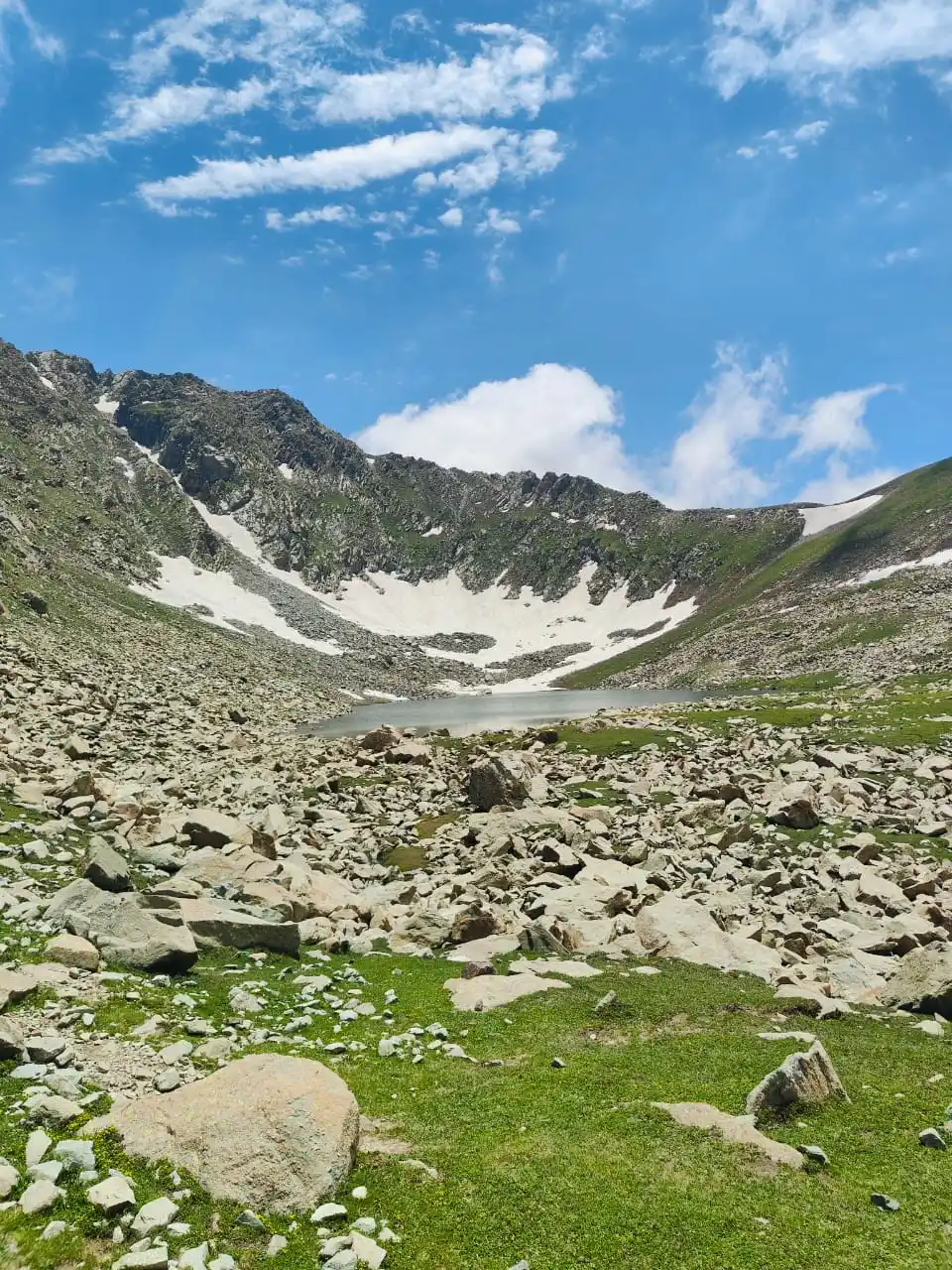 The fourth day of the trek is what you have been waiting for. We will get to see the largest and one of the most famous lakes of the Pir Panjal ranges–Neelsar. Our trek section will start with descending from the Khuan Meadow and continuing towards the left from the col. After continuing walking for about 20 minutes, you come across a small stream winding through loose boulders.